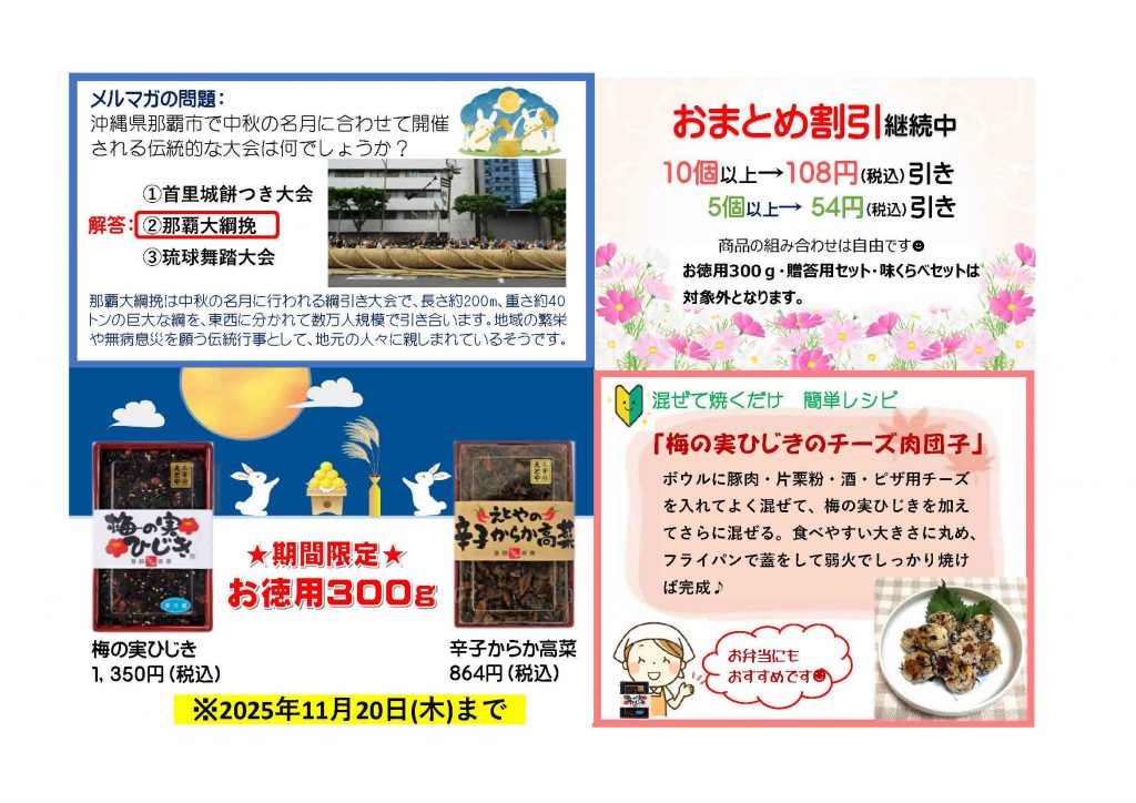 メルマガ♪答え:本日スタート!◆梅の実ひじきお徳用300g◆新米のお供にいかがですか?